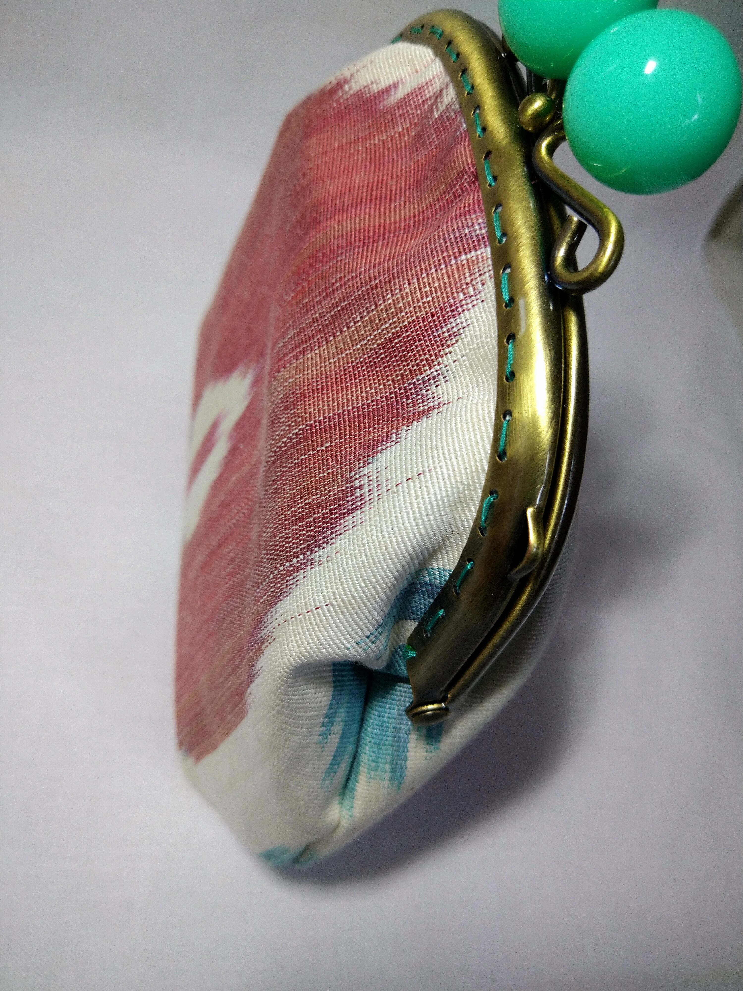 ウズベキスタンの伝統絹織物を使用し、がま口ポーチを作りました。中はミントグリーン地に薔薇柄。