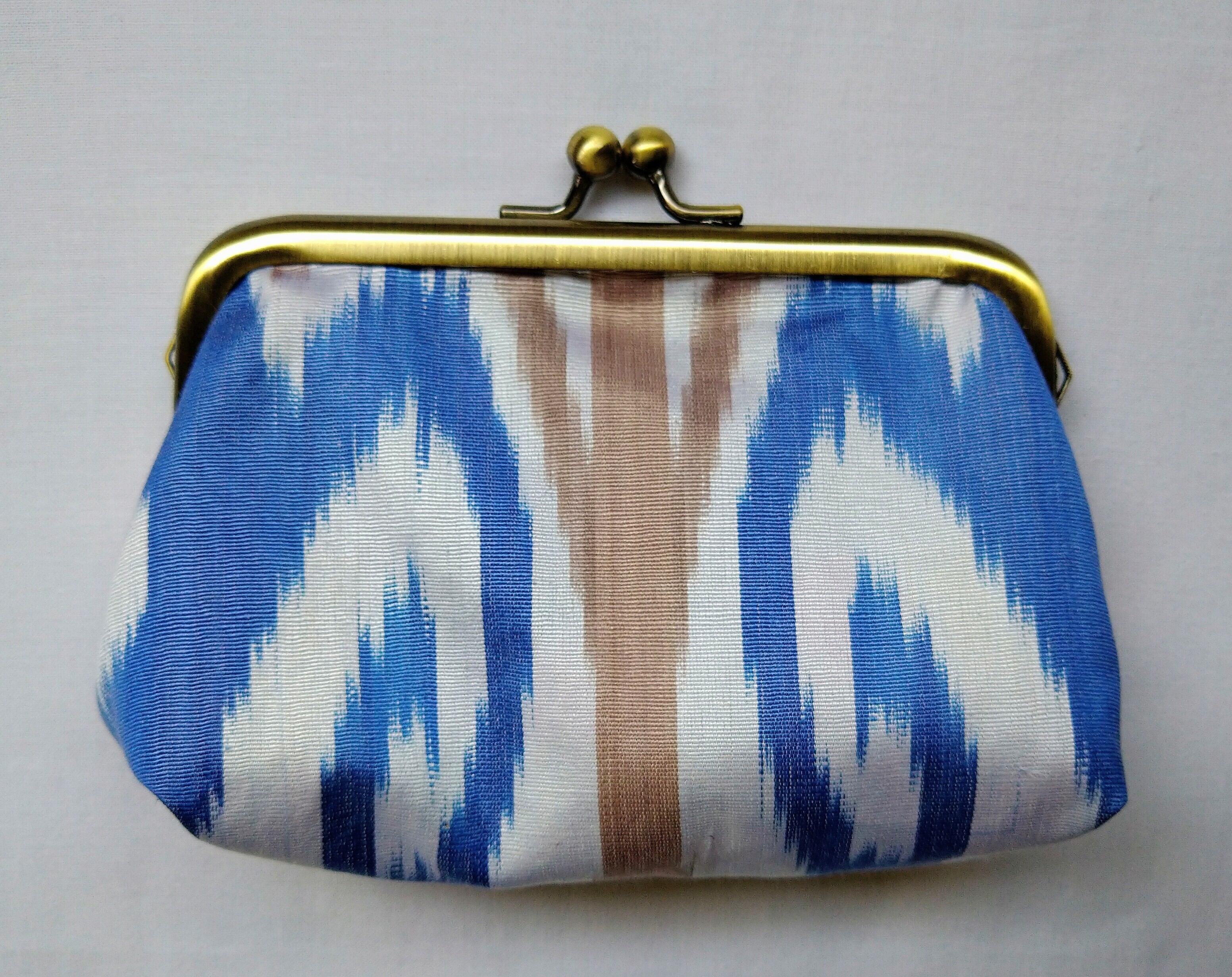 ウズベキスタンの伝統絹織物を使用し、がま口ポーチを作りました。