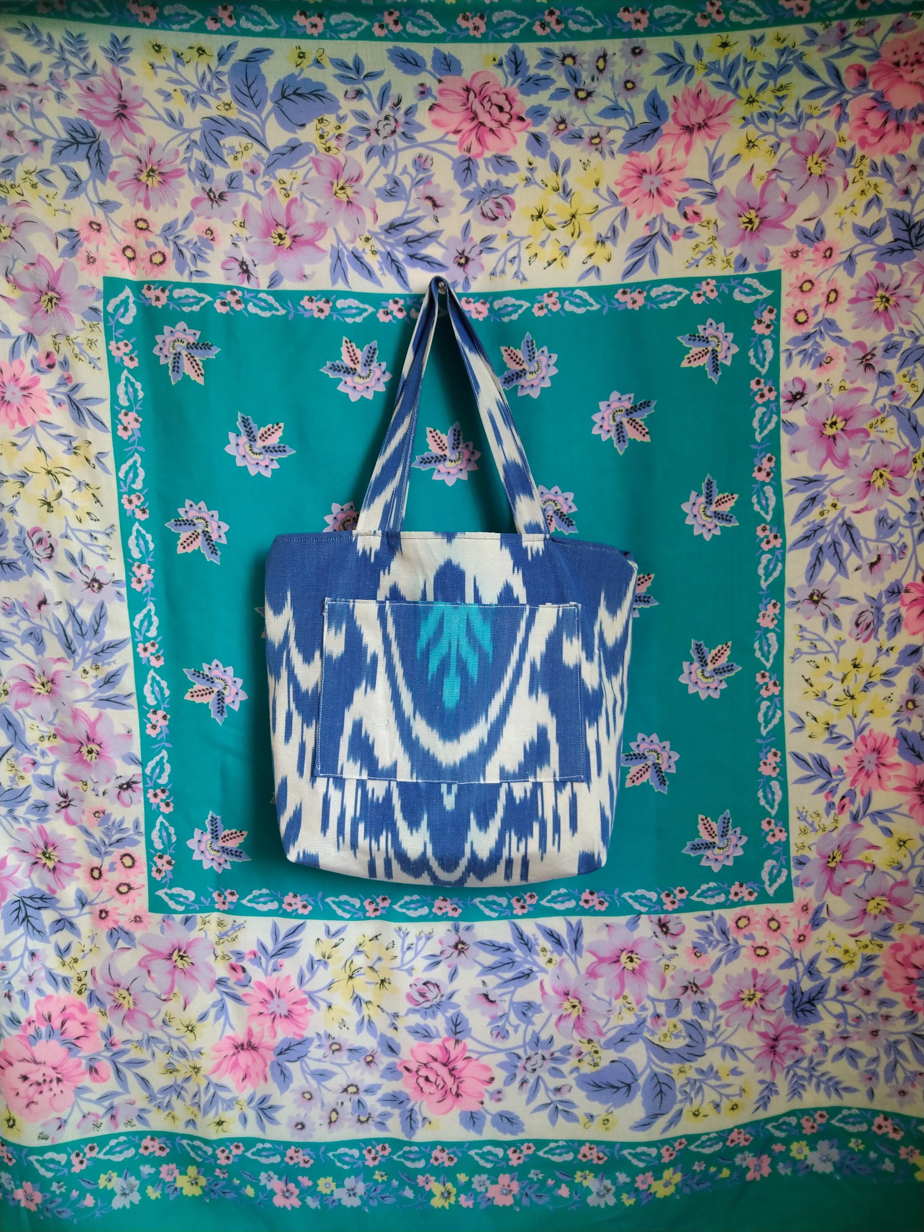 ウズベキスタンの伝統絹織物を使用しバックを作りました。外ポケット1つあります。